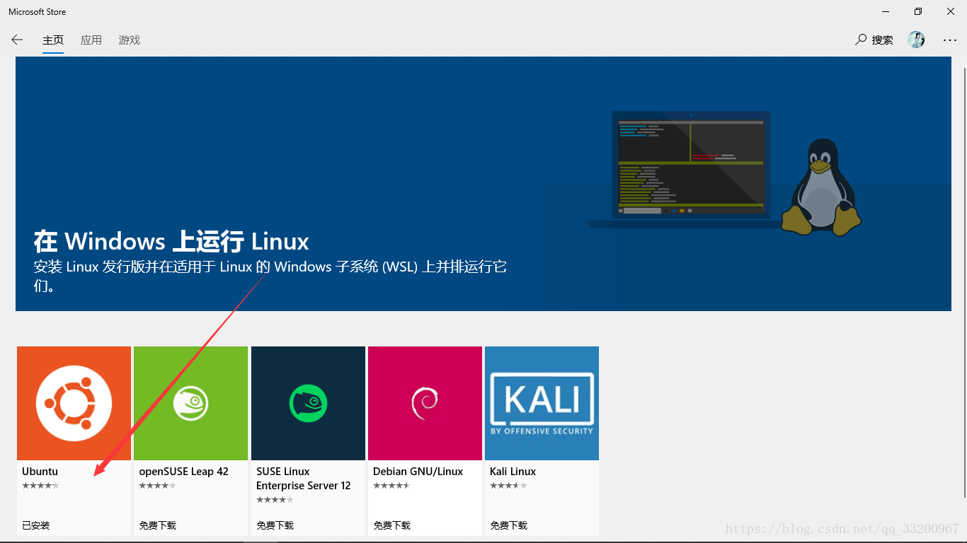 然后选择Ubuntu点击进入,因为笔者已经安装了,所以这里显示是已安装,如果没有安装,应该是显示免费下载。然后点进去获取安装即可。