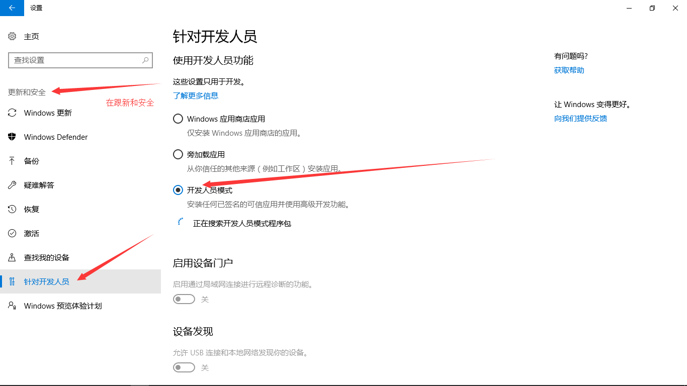 然后打开设置—>更新和安全—>针对开发人员,选择开发人员模式—>确定启动就行了