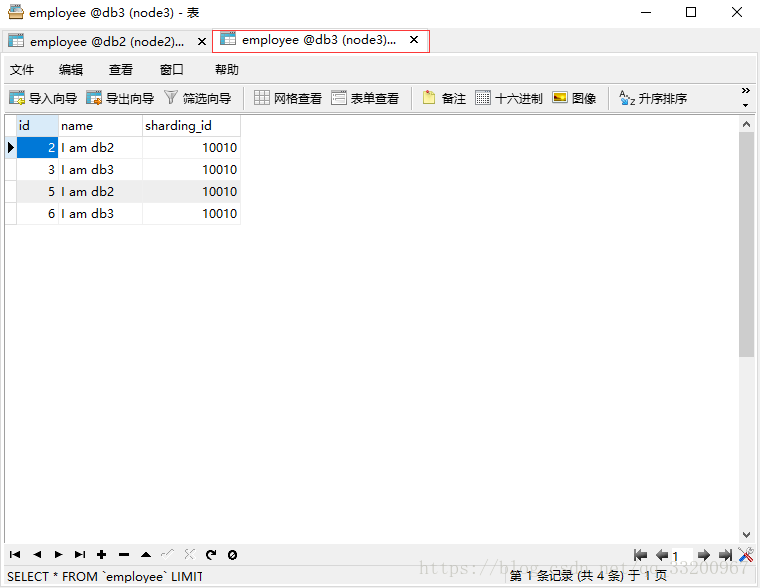 insert into employee(id,name,sharding_id) values(4, 'I am db1',10000);