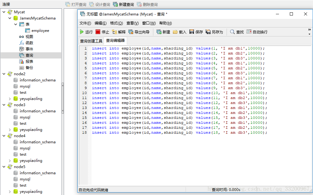 然后连接node1的Mycat,记得Mycat默认的端口是8066,账号和密码是server.xml中设置的。连接之后可以看到一个JamesMycatSchema数据库,这个就是我们在schema.xml配置的,可以看到有一张employee表,我们新建查询在这里插入一些数据: