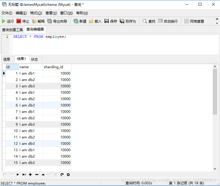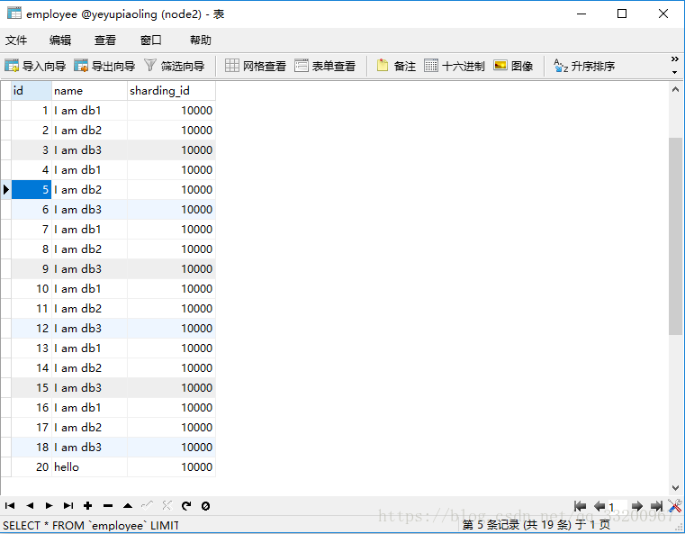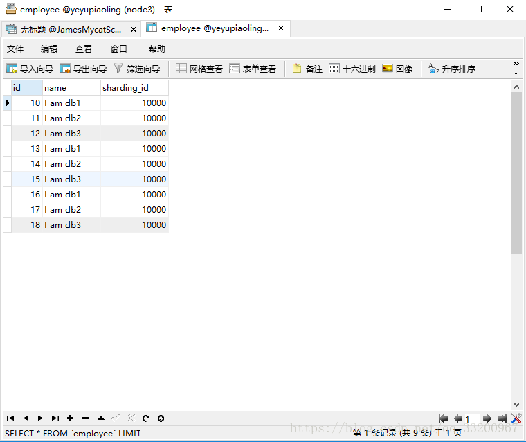 在Mycat中可以可以看到employee表已经插入的全部数据。
