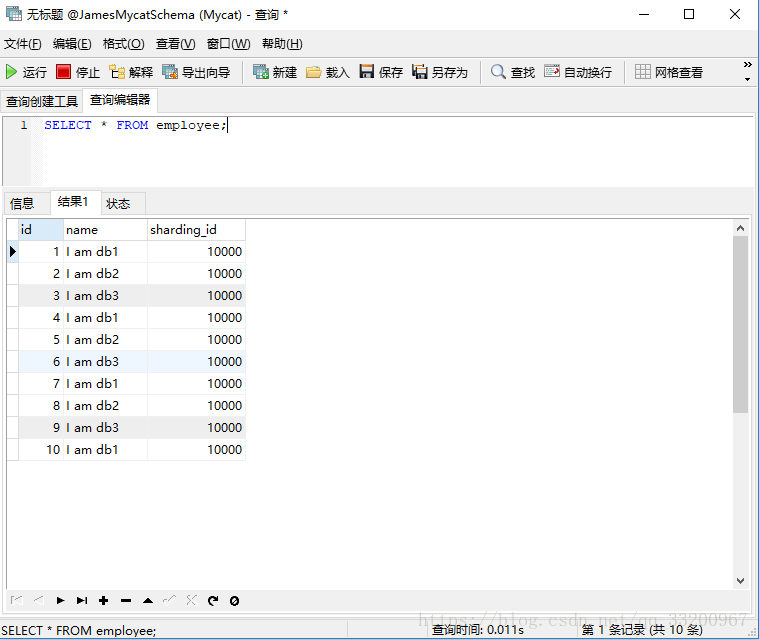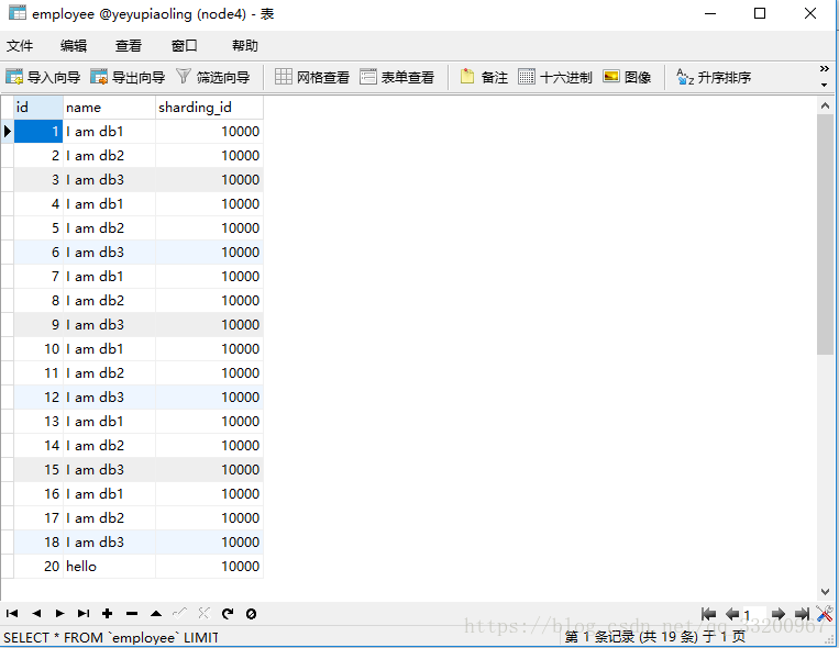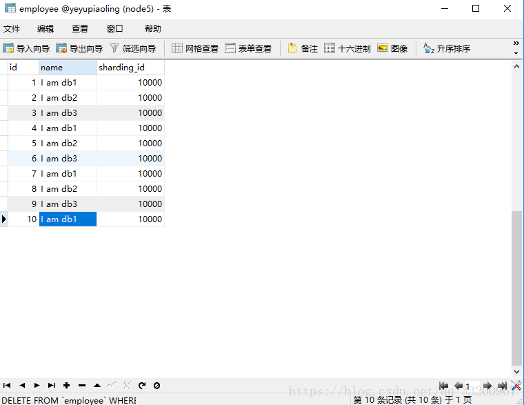 insert into employee(id,name,sharding_id) values(10, 'I am db1',10000);