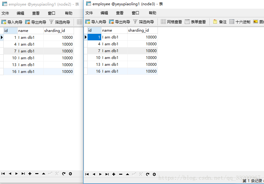 然后在node2和node3的数据库中都可以看到插入的数据库,根据分片规则存储方式,这里是就是这个数据库存储的数据。