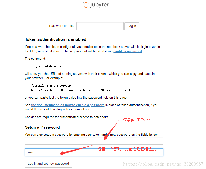然后我们在浏览器上输入IP地址,如何是在本地,那就就输入localhost,得到的页面如下,输入终端输出的token和新密码就可以登录使用jupyter了: