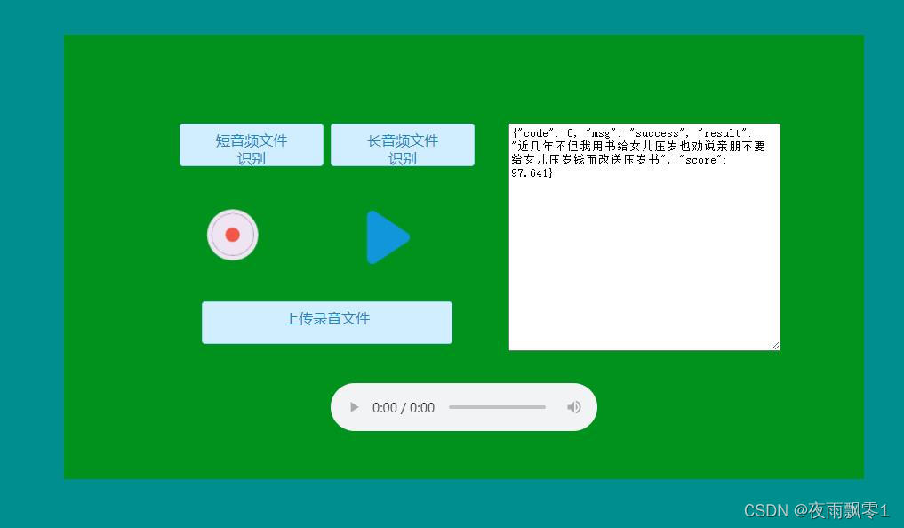 在服务器执行下面命令通过创建一个Web服务,通过提供HTTP接口来实现语音识别。启动服务之后,如果在本地运行的话,在浏览器上访问http://localhost:5000,否则修改为对应的 IP地址。打开页面之后可以选择上传长音或者短语音音频文件,也可以在页面上直接录音,录音完成之后点击上传,播放功能只支持录音的音频。支持中文数字转阿拉伯数字,将参数--to_an设置为True即可,默认为True。