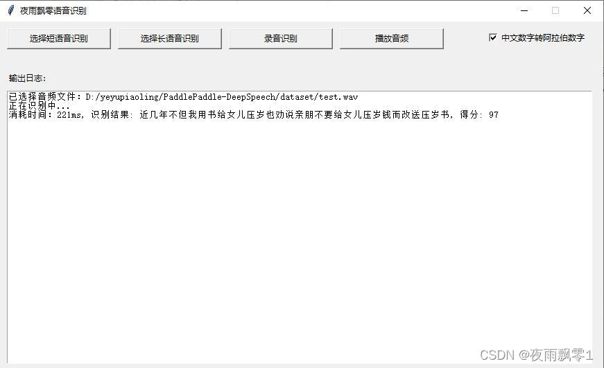 我们可以使用这个脚本使用模型进行预测,如果如何还没导出模型,需要执行导出模型操作把模型参数导出为预测模型,通过传递音频文件的路径进行识别,通过参数--wav_path指定需要预测的音频路径。支持中文数字转阿拉伯数字,将参数--to_an设置为True即可,默认为True。
